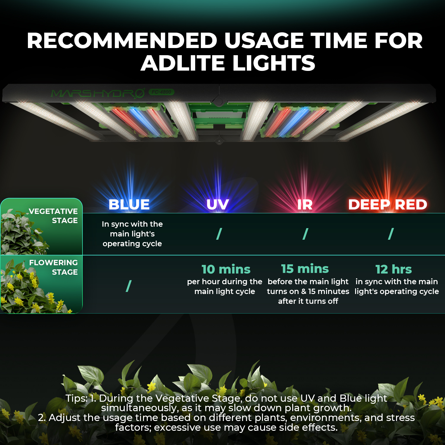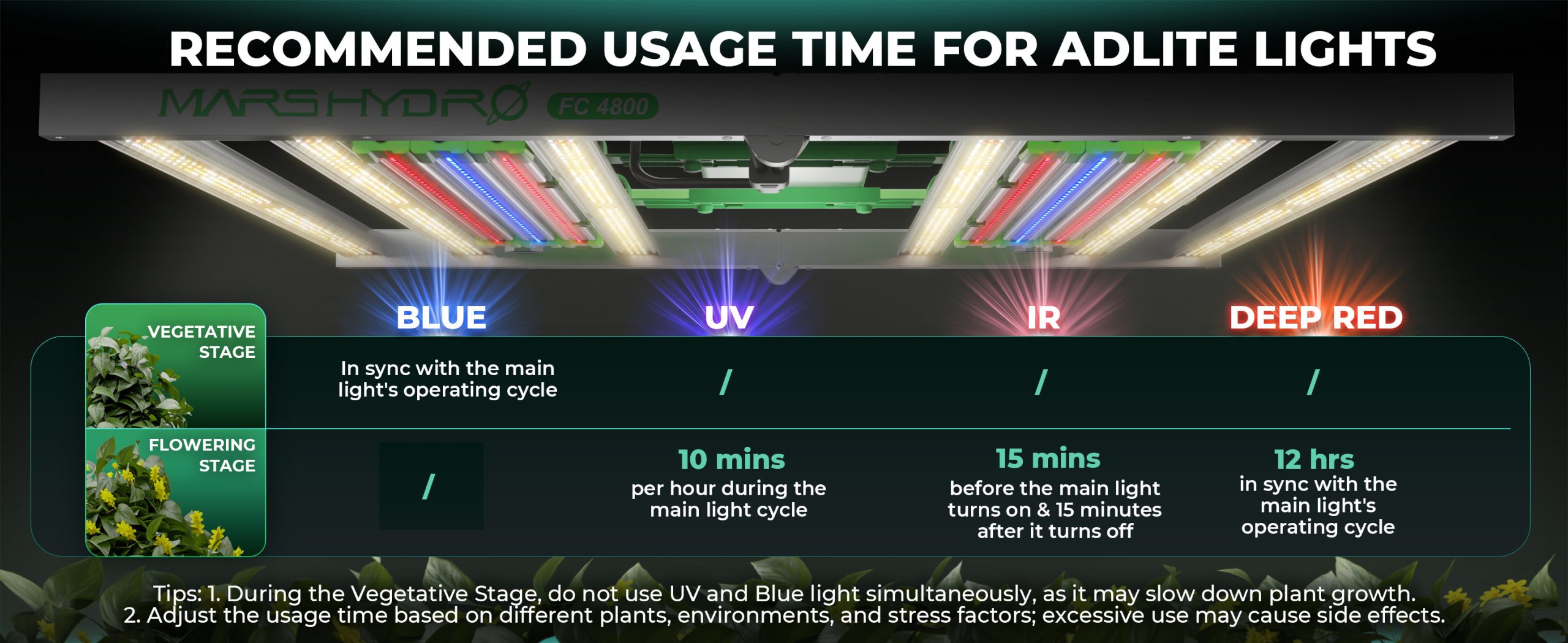 Each light type plays a specific role during a plant's life cycle — and timing matters. For specific usage times, please refer to the chart at the bottom of this page.