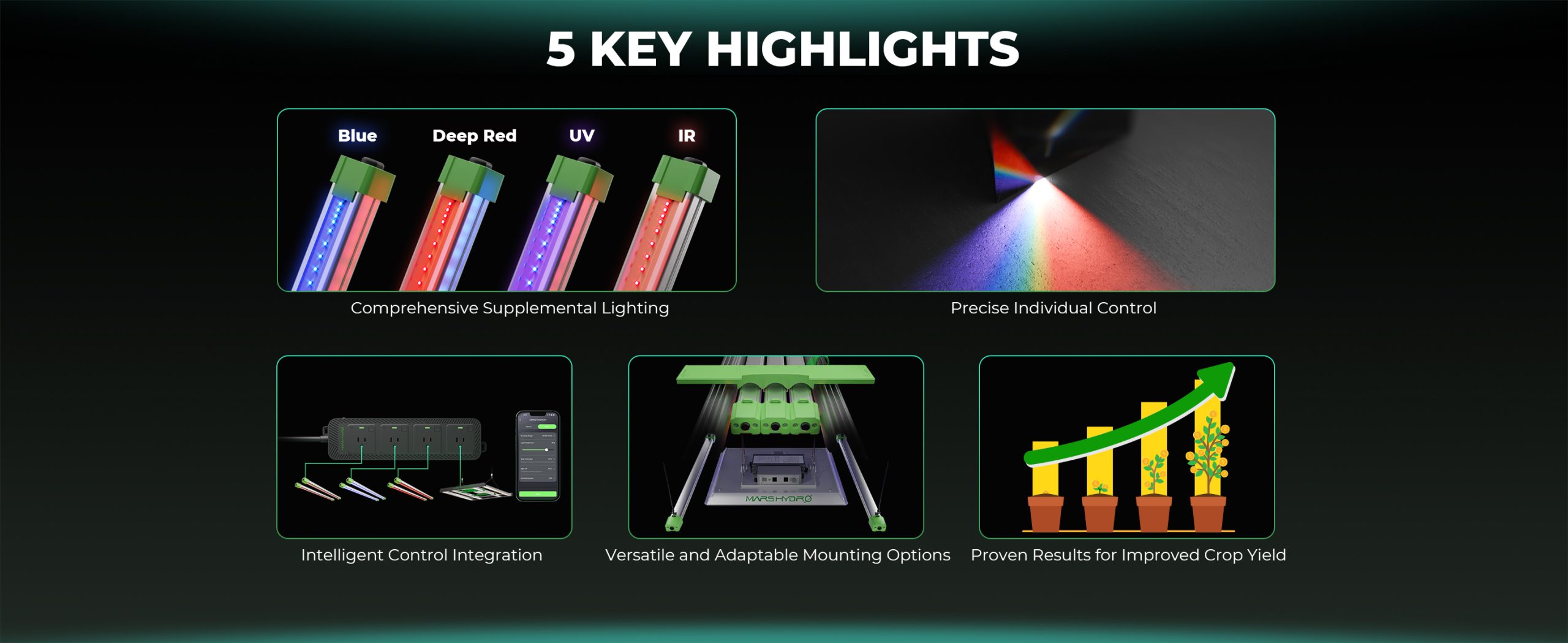 As a pioneer in the industry, Mars Hydro was the first to develop and introduce multifunctional supplemental LED light bars and has been continuously investing in this field for years. We offer the most comprehensive ranges of supplemental light bars, including UV, IR, Blue, and Deep Red spectrums.